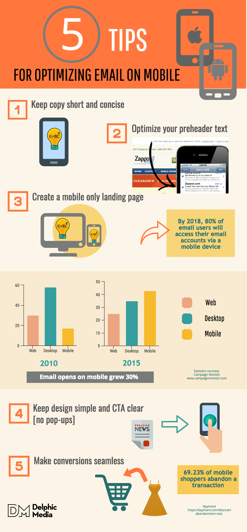 What were the numbers? Experian found that personalized subject lines resulted in a 49% increase in transaction rates and 41.8% increase in open rates. A “mobile-first” email strategy is just plain smart. As you think about what to implement for mobile email success, here are 5 things to keep in mind: